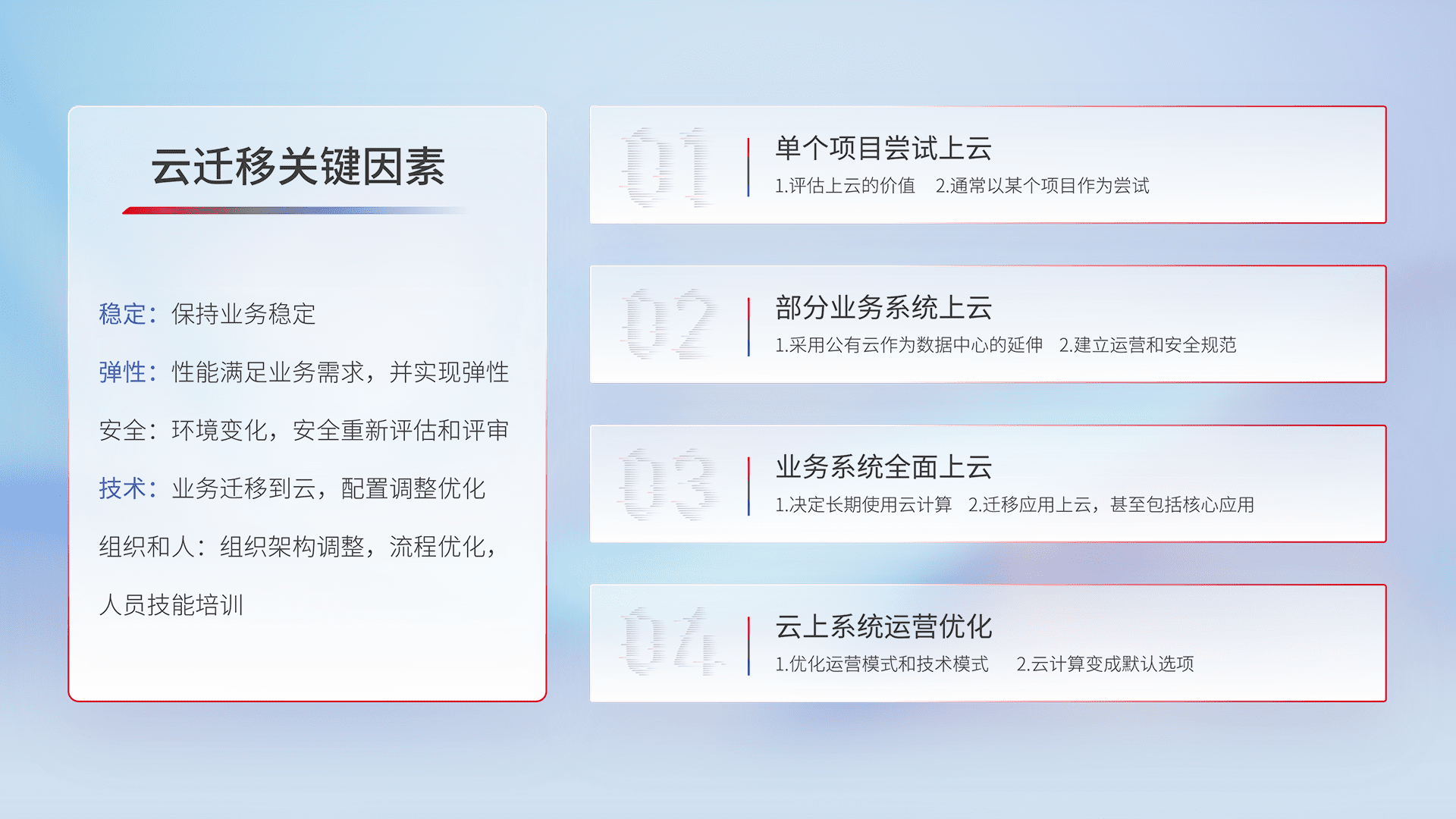 结合实际业务,,从规划设计、、、、云平台选型、、、、云原生改造、、、、数据迁移、、、集成交付,,,,迁移全过程为客户识别最佳上云路径,,,,做好风险识别管理,,,,设计网络架构、、、身份权限、、、、安全审计合规、、操作审计、、、、日志审计、、监控告警策略、、多站点容灾设计等,,,对云上基础设施进行整体规划,,,提升IT治理水平,,,以满足弹性、、、高可用、、、高性能的需求。。。