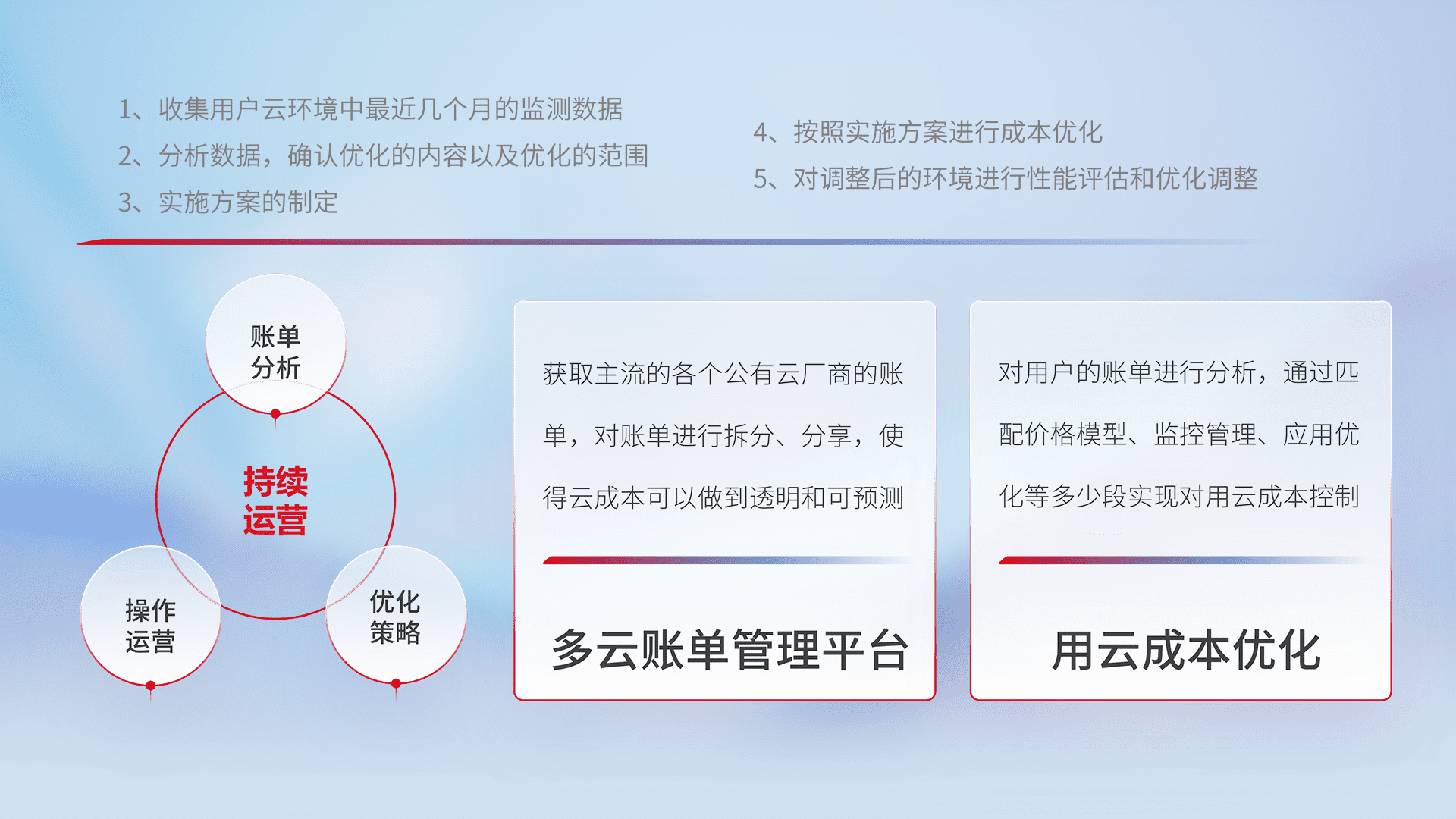 通过多云纳管,,以统一的资源数据模型把客户的云资源进行抽象和封装,,进而实现对多云资源的统一操作,,,保障云资源管理的可靠性、、、稳定性与可用性。。。量身定制化运维内容,,,,配置、、、开发运维、、补丁管理、、、备份、、、监控、、认证和访问管理、、、、审计和日常巡检等,,,保障在用云过程中的可靠度,,,,稳定度以及高可用率。。。。